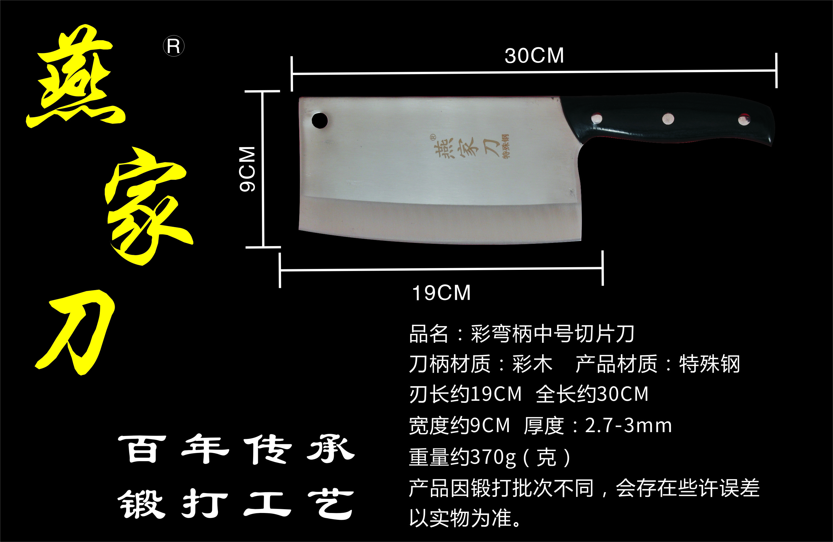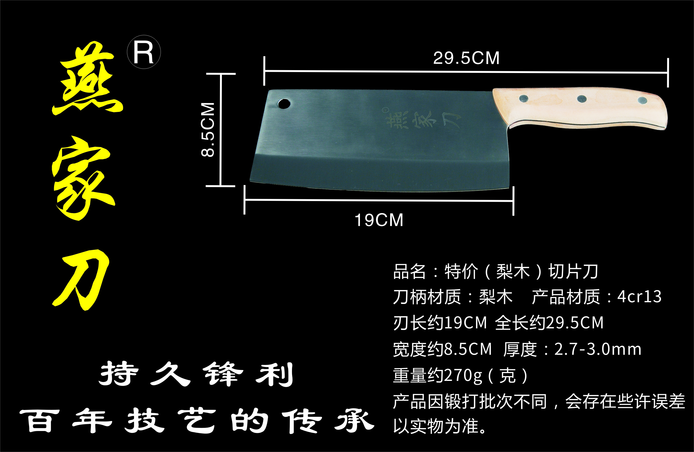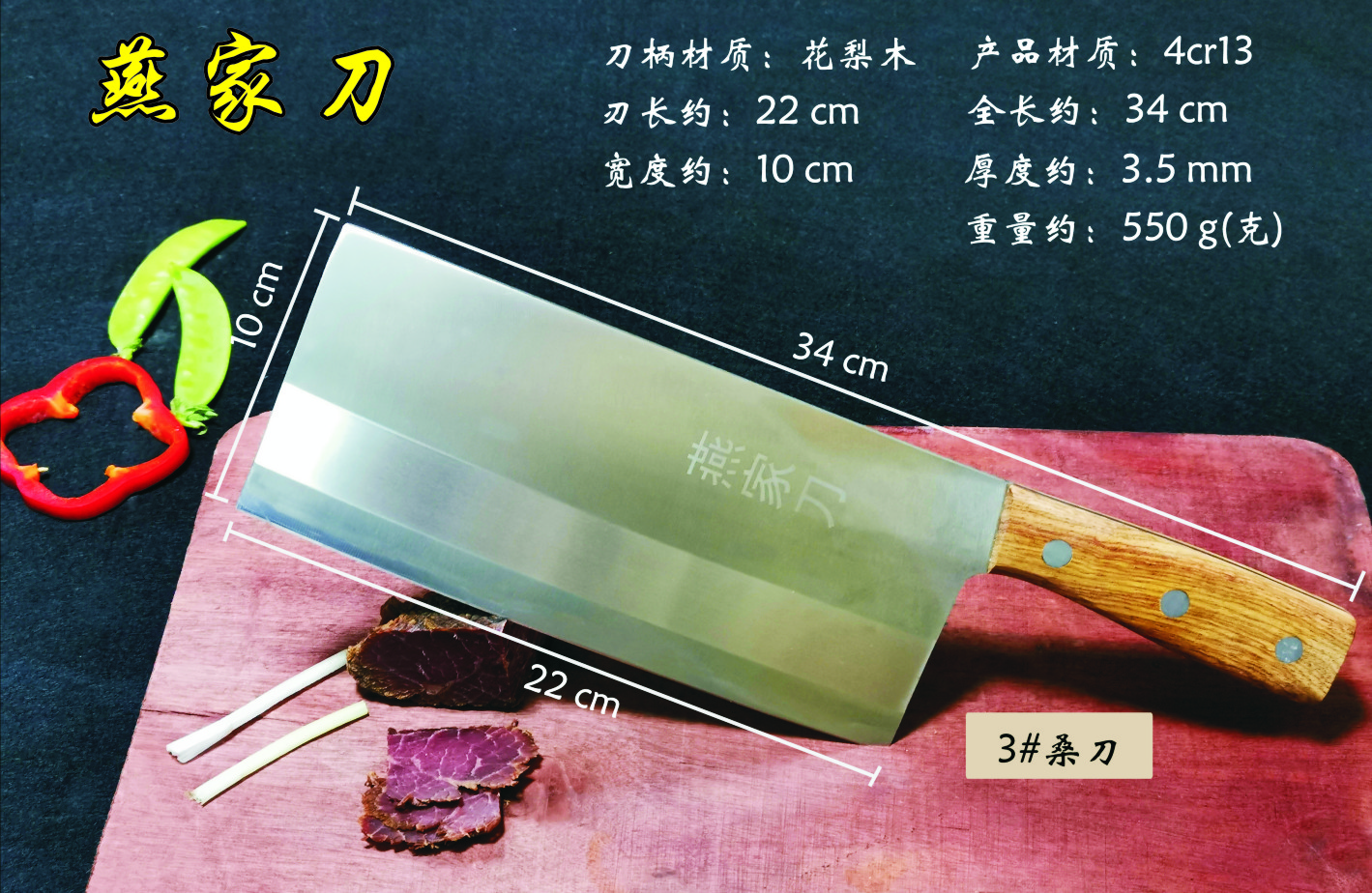 樂山燕家刀具有限公司(公司前身為燕佳鐵匠鋪),公司坐落于美麗的佛都之鄉(xiāng)樂山嘉州,在全國各地有上千家代理經(jīng)銷點(diǎn),公司專業(yè)銷售、設(shè)計、制作各類刀具。秉承一貫鍛造三精要求,即選料精、用料精、工藝精。所選材料全部產(chǎn)自滇東鐵礦優(yōu)產(chǎn)區(qū)。本品牌刀具堅持千挑萬選為材,千錘百煉為刀的手工鍛造工藝宗旨。具有鋒利耐磨、持久耐用,用料上乘,硬度高、韌度強(qiáng)的特點(diǎn)!