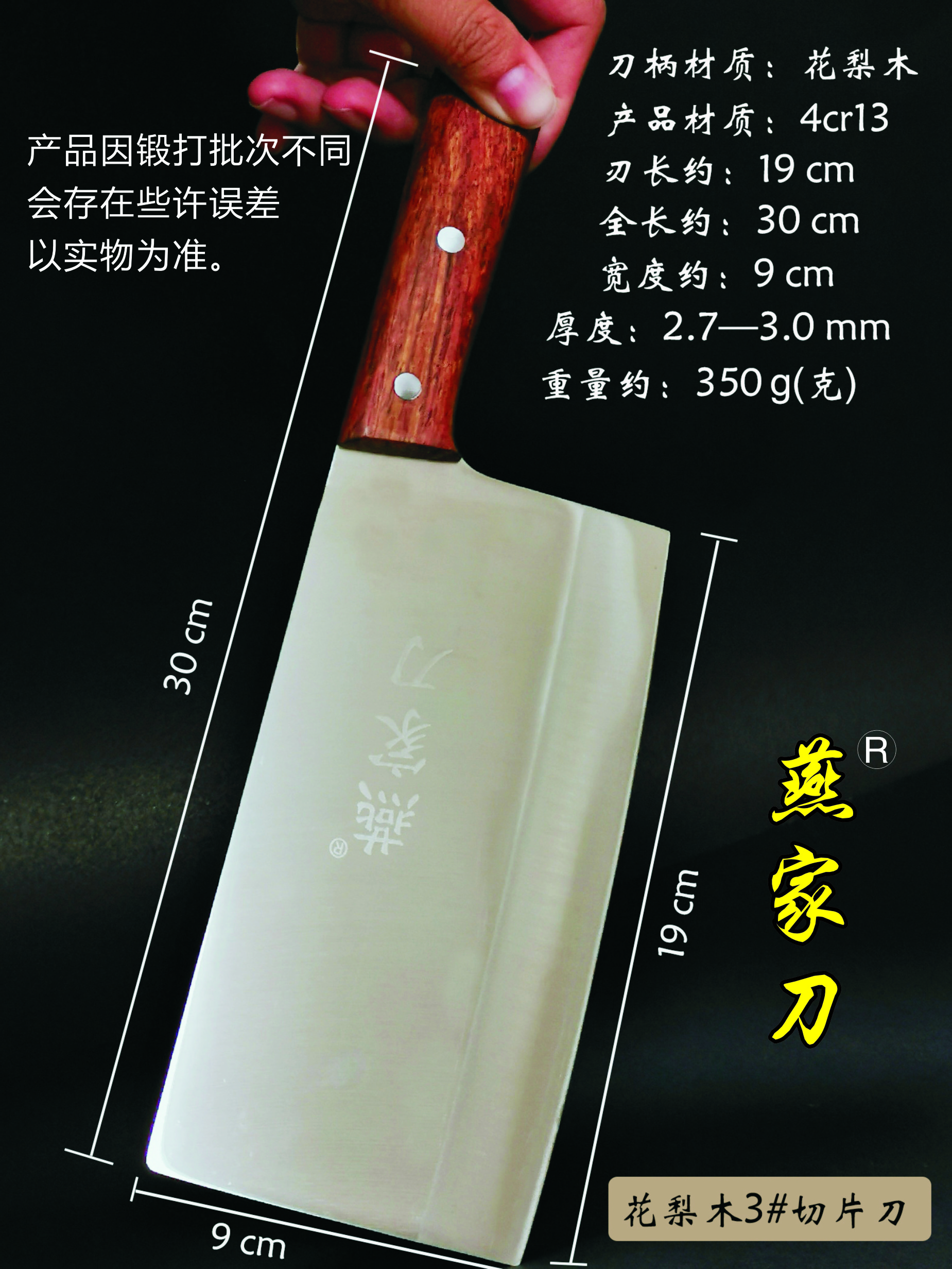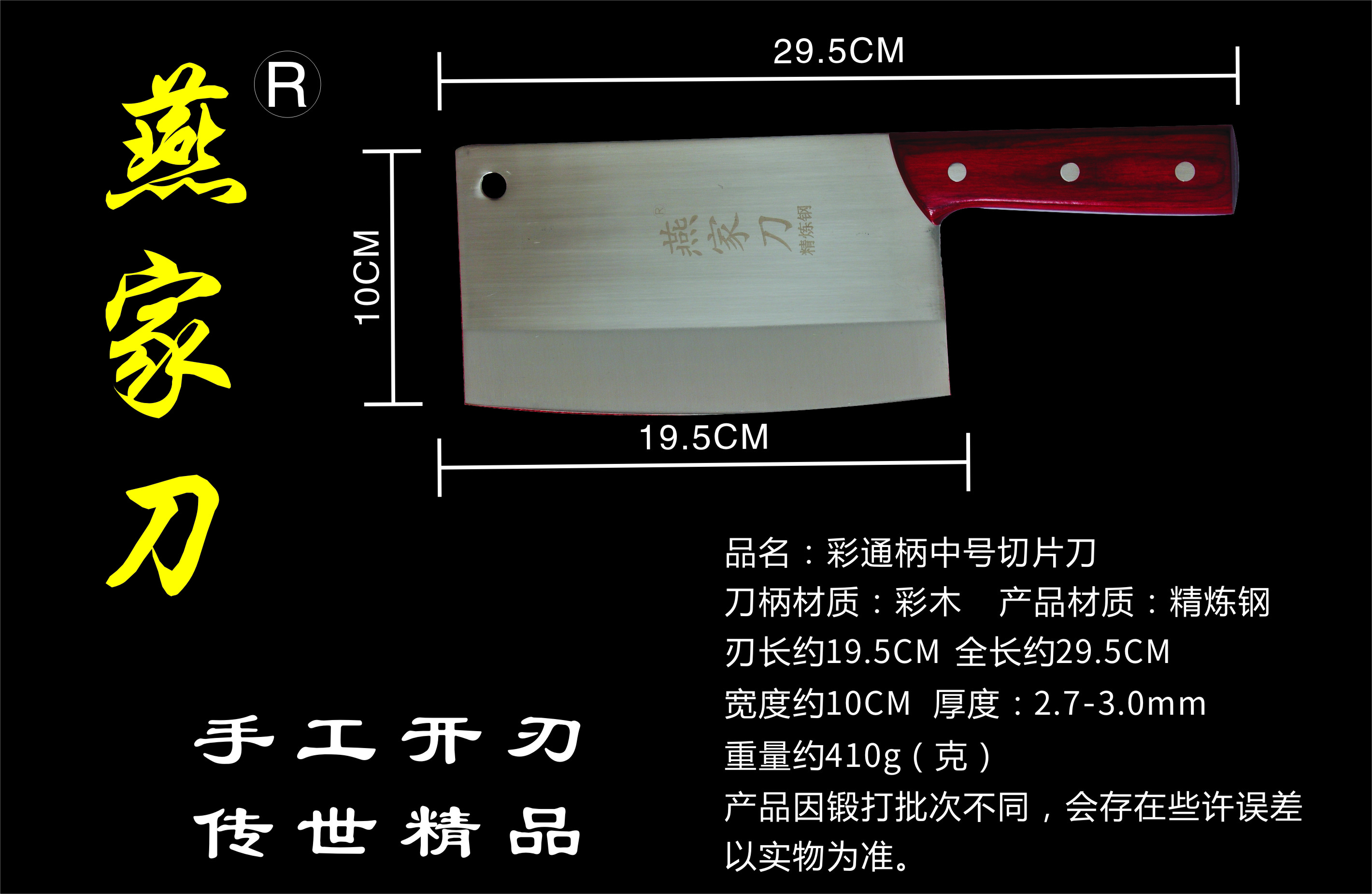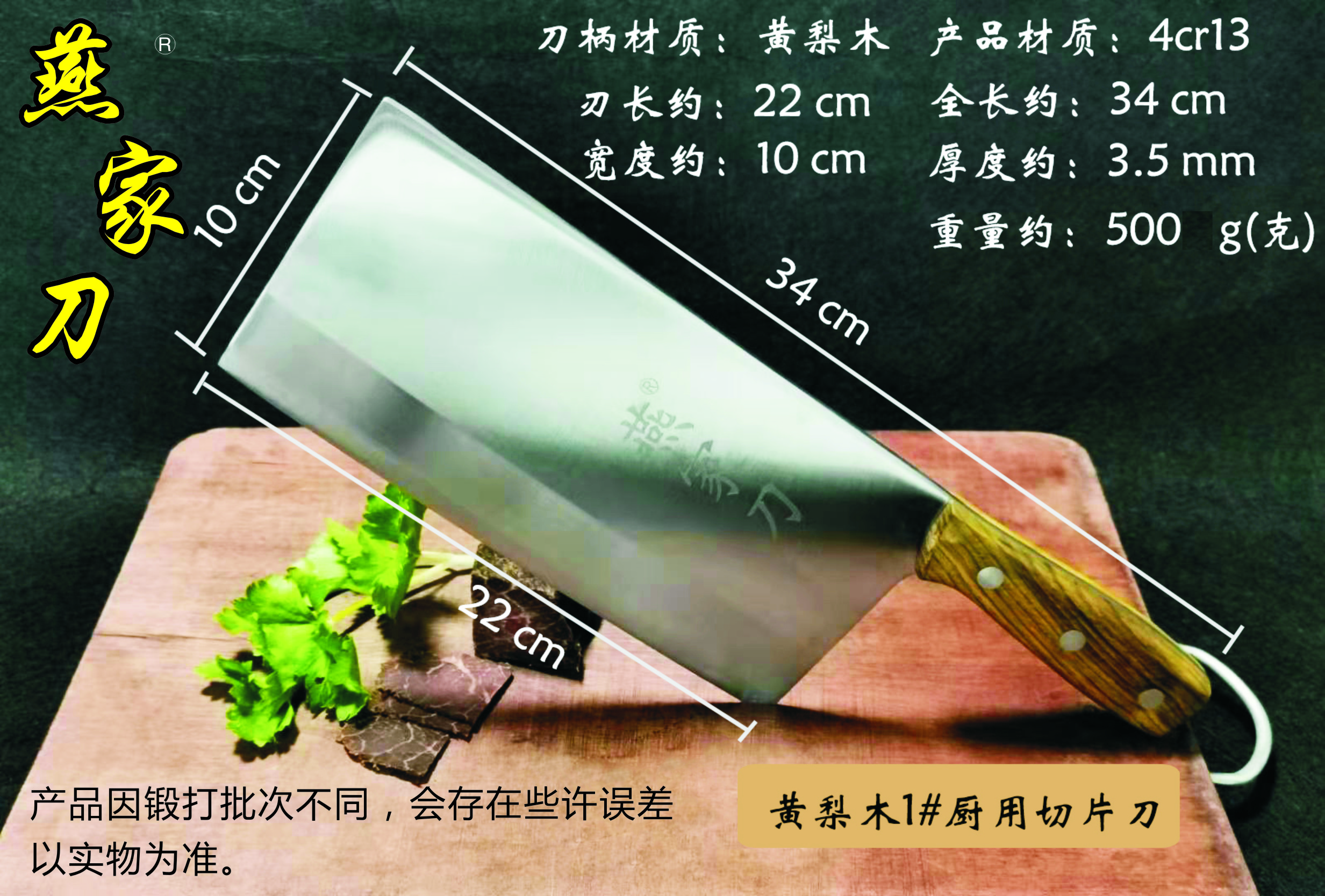 樂山燕家刀具有限公司(公司前身為燕佳鐵匠鋪),公司坐落于美麗的佛都之鄉(xiāng)樂山嘉州,在全國各地有上千家代理經(jīng)銷點(diǎn),公司專業(yè)銷售、設(shè)計、制作各類刀具。秉承一貫鍛造三精要求,即選料精、用料精、工藝精。所選材料全部產(chǎn)自滇東鐵礦優(yōu)產(chǎn)區(qū)。本品牌刀具堅持千挑萬選為材,千錘百煉為刀的手工鍛造工藝宗旨。具有鋒利耐磨、持久耐用,用料上乘,硬度高、韌度強(qiáng)的特點(diǎn)!
